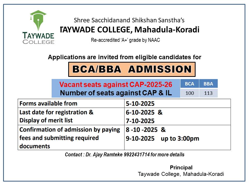Education is the key to creating, adapting and spreading knowledge in all the disciplines and subjects. Keeping this objectives in mind. Taywade College Mahadula koradi Nagpur was started 1993.